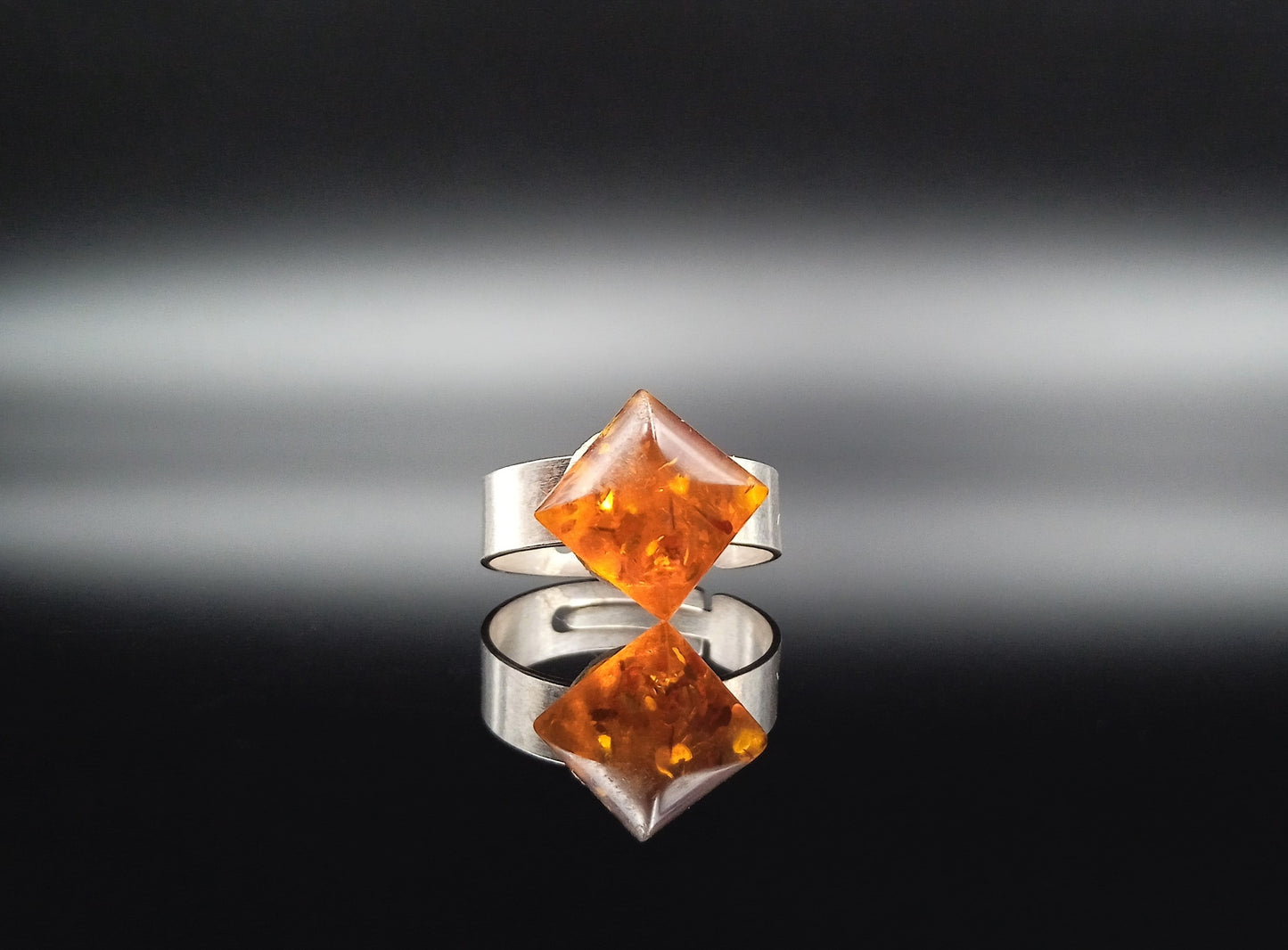 Baltic amber ring made of 925 silver, color red-brown , square shape.