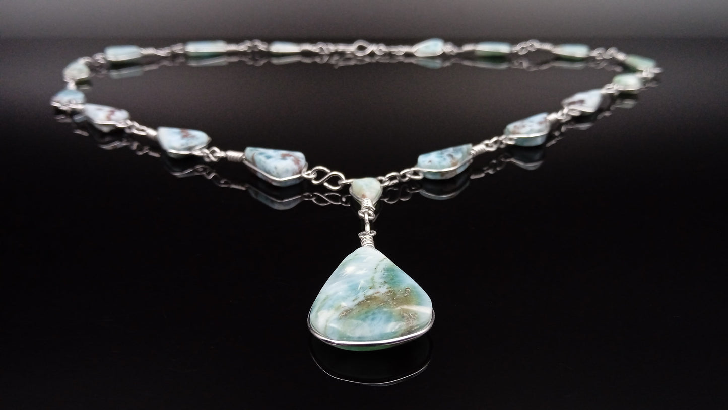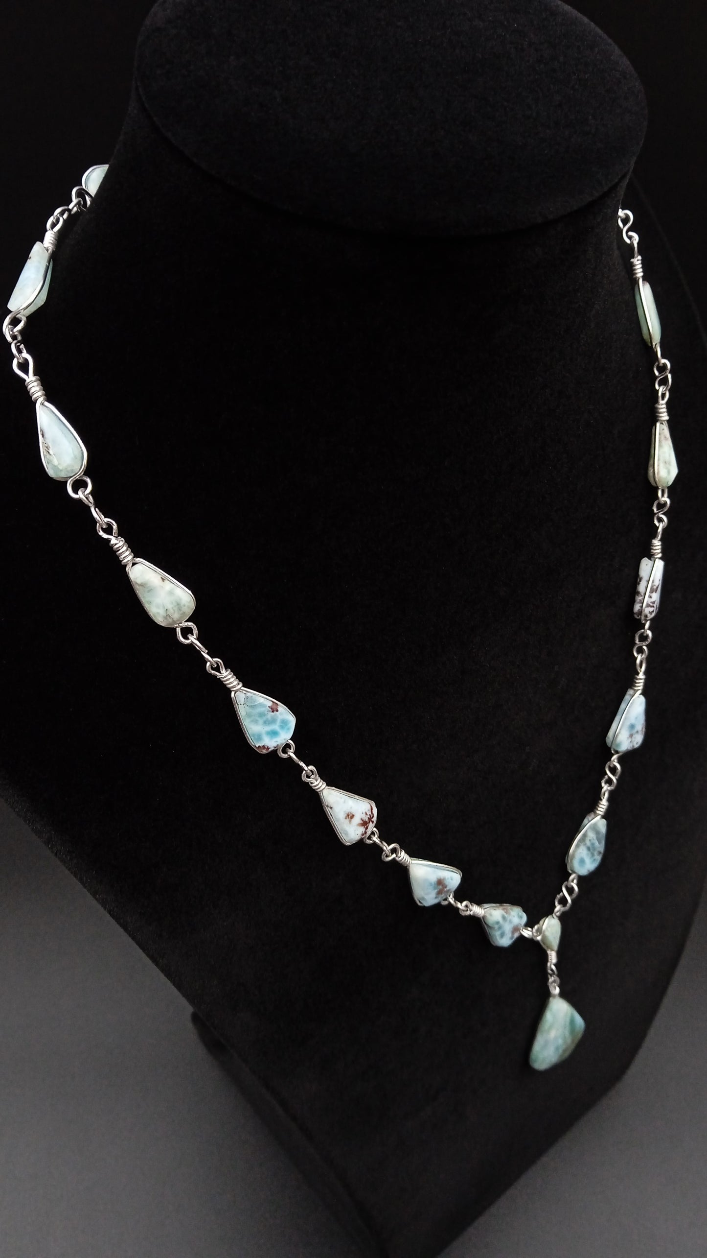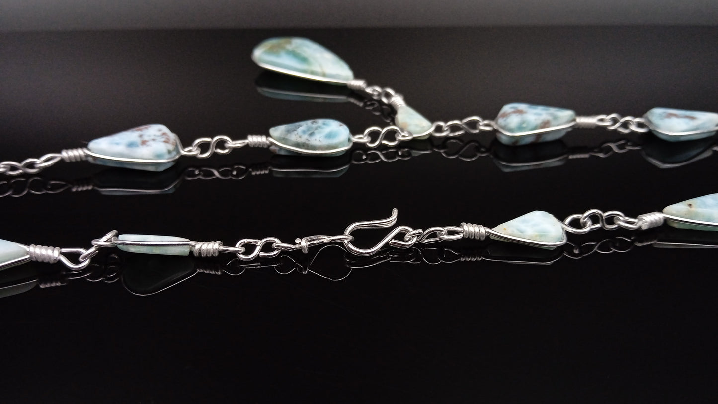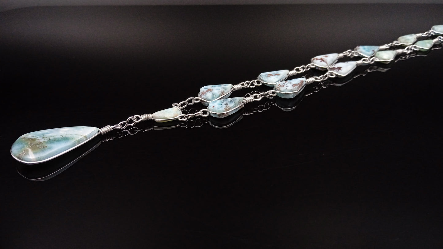 A beautiful silver necklace with teardrop-shaped Larimar stones
