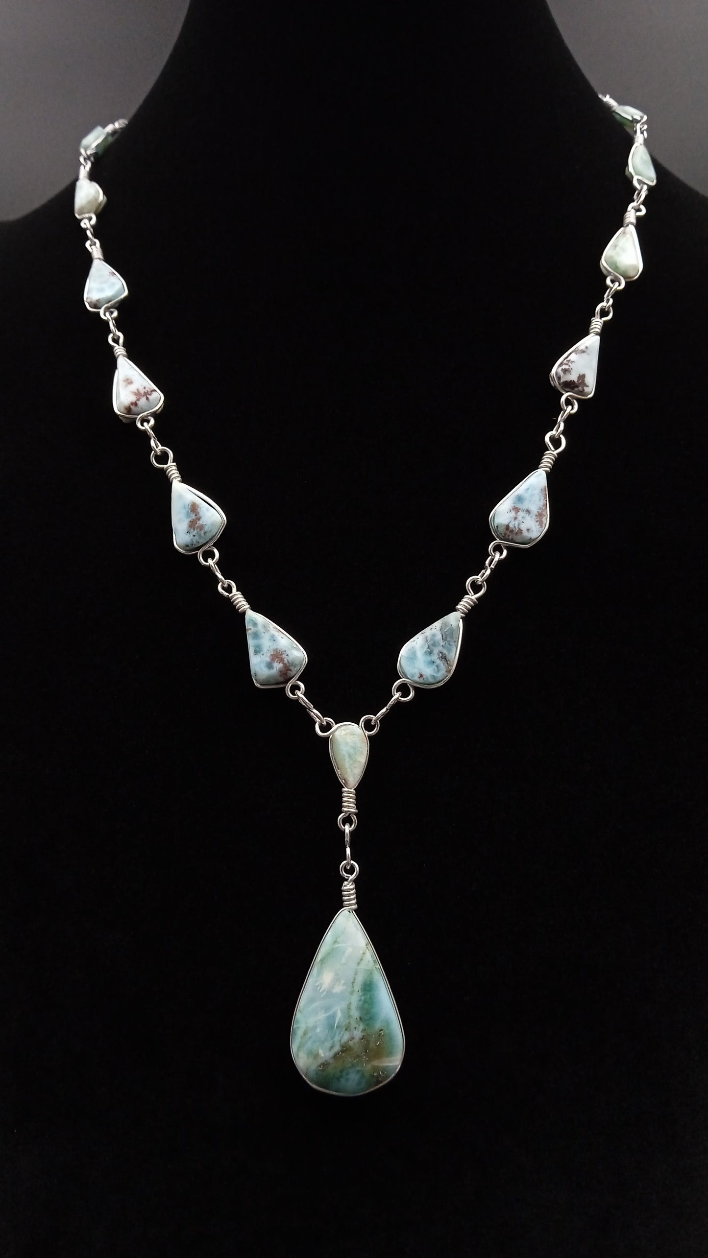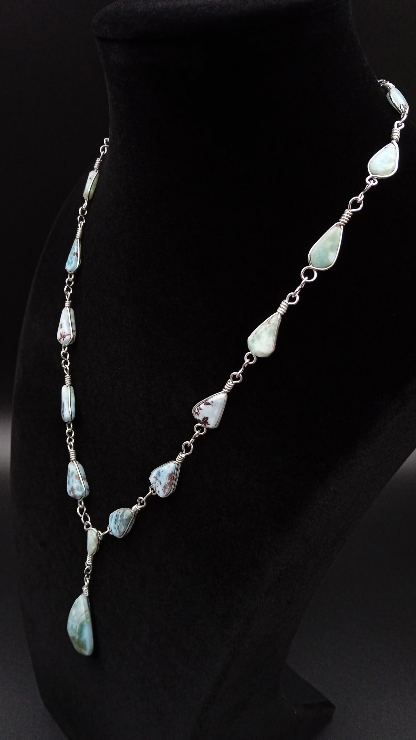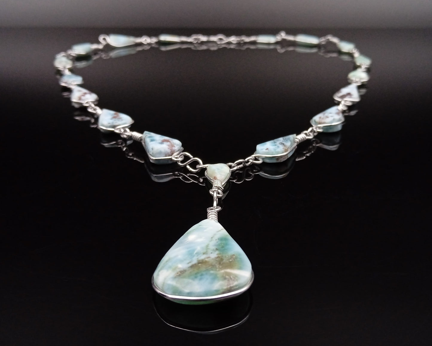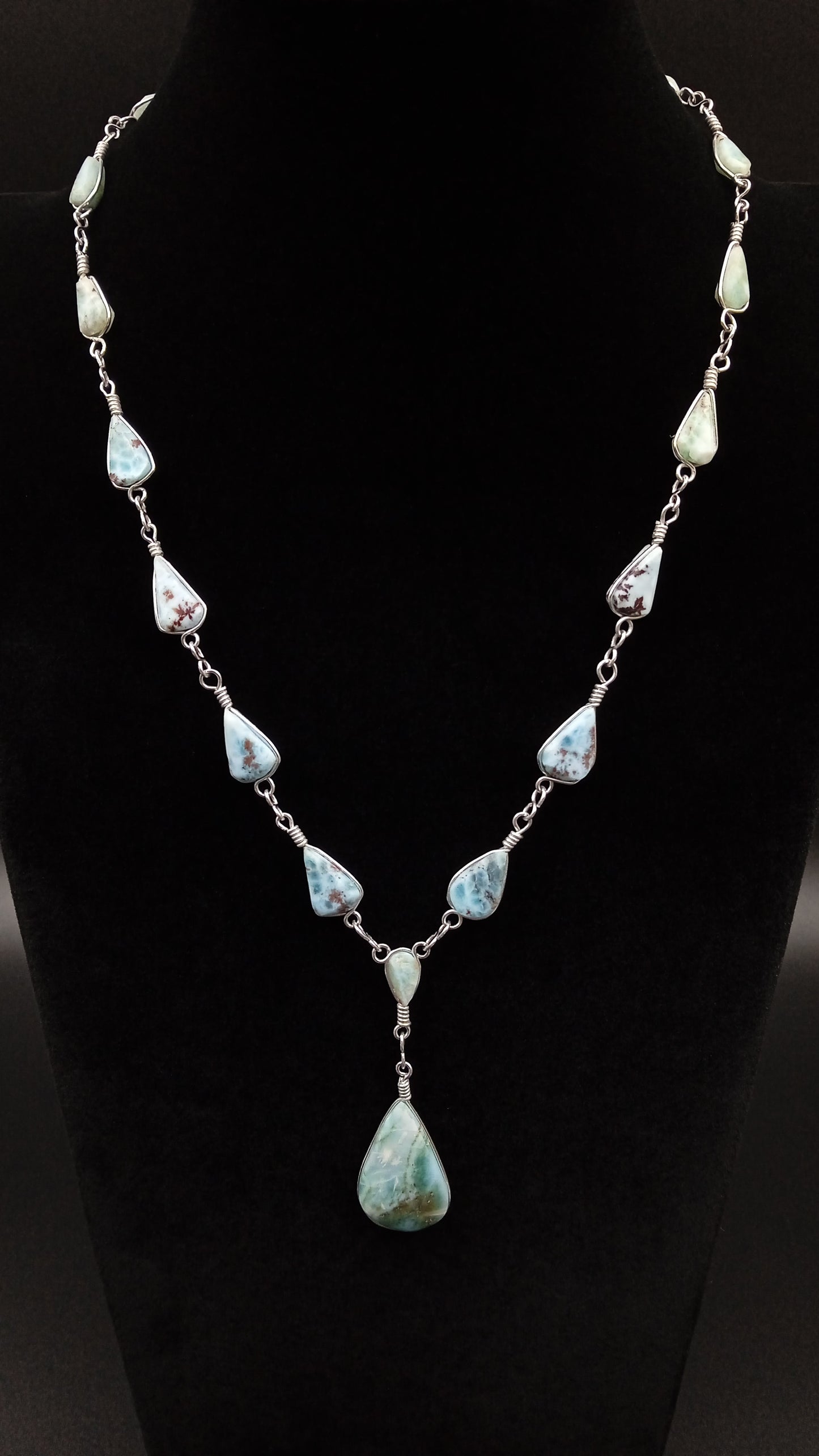 A beautiful silver necklace with teardrop-shaped Larimar stones
